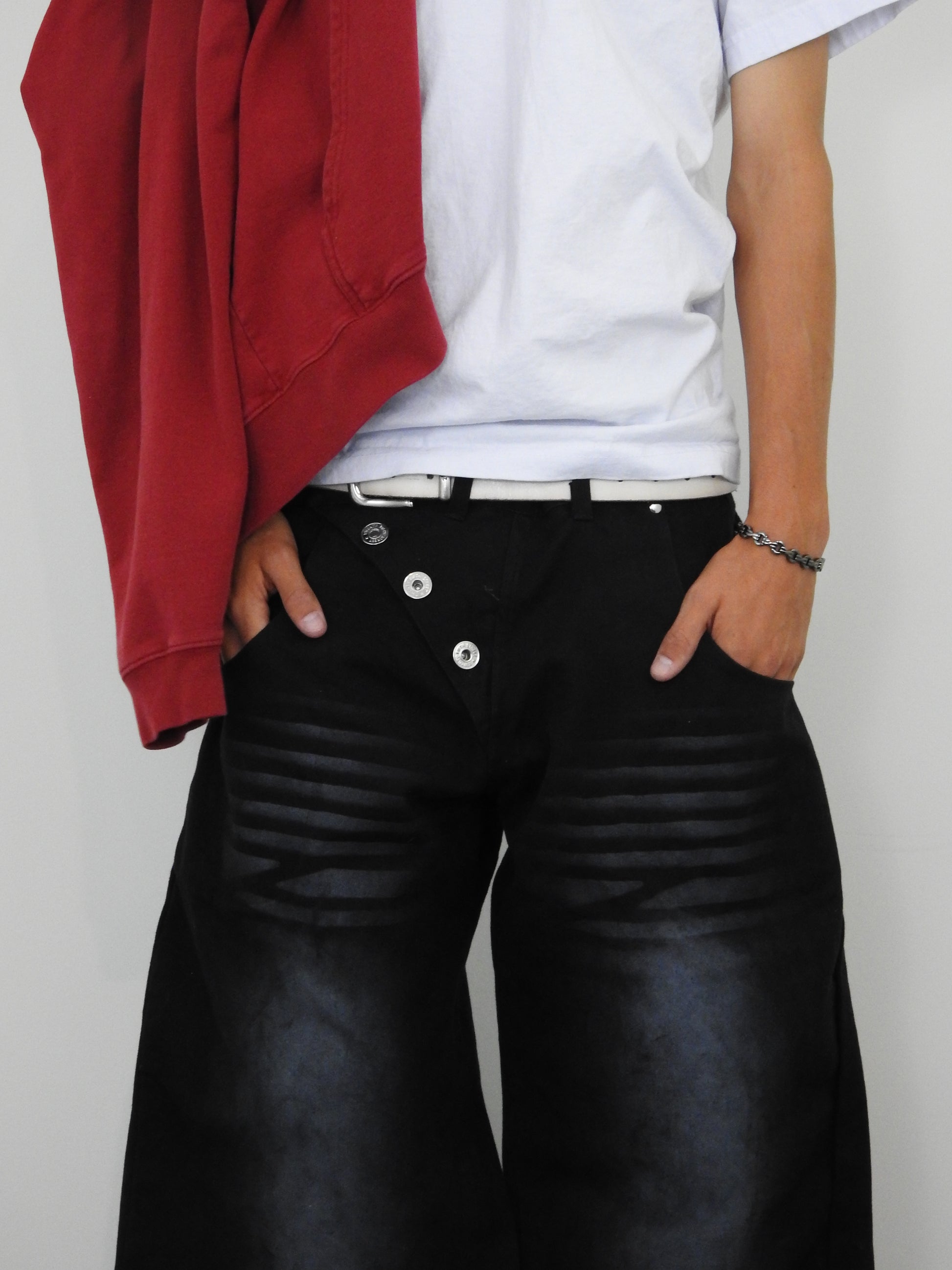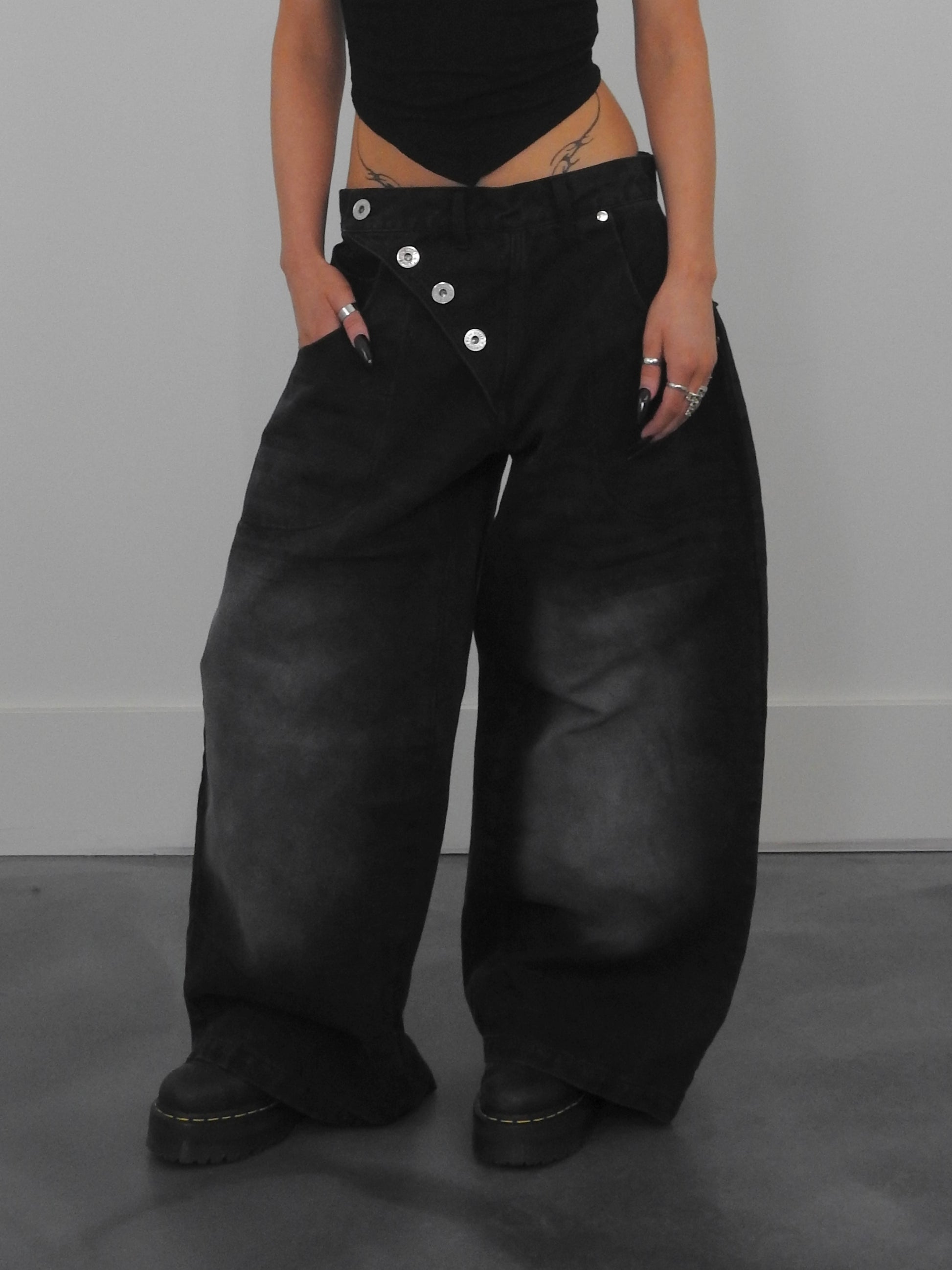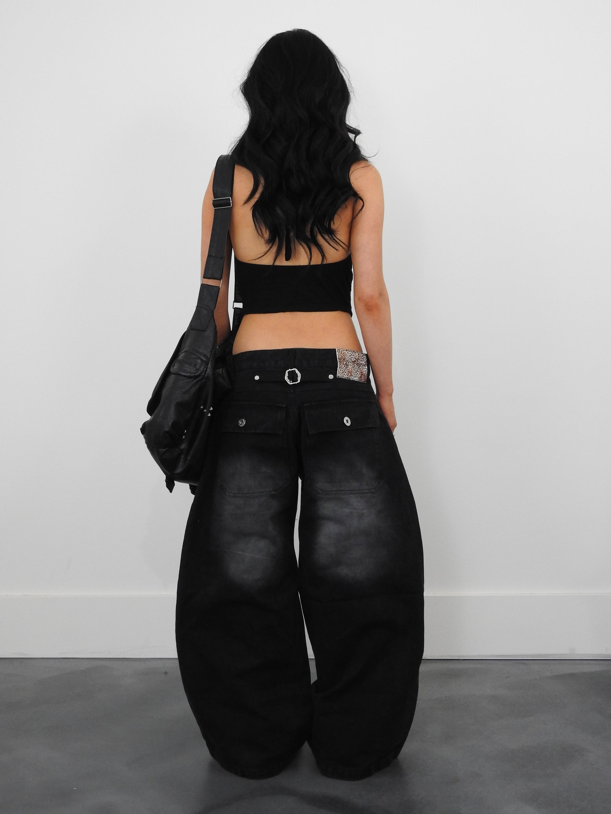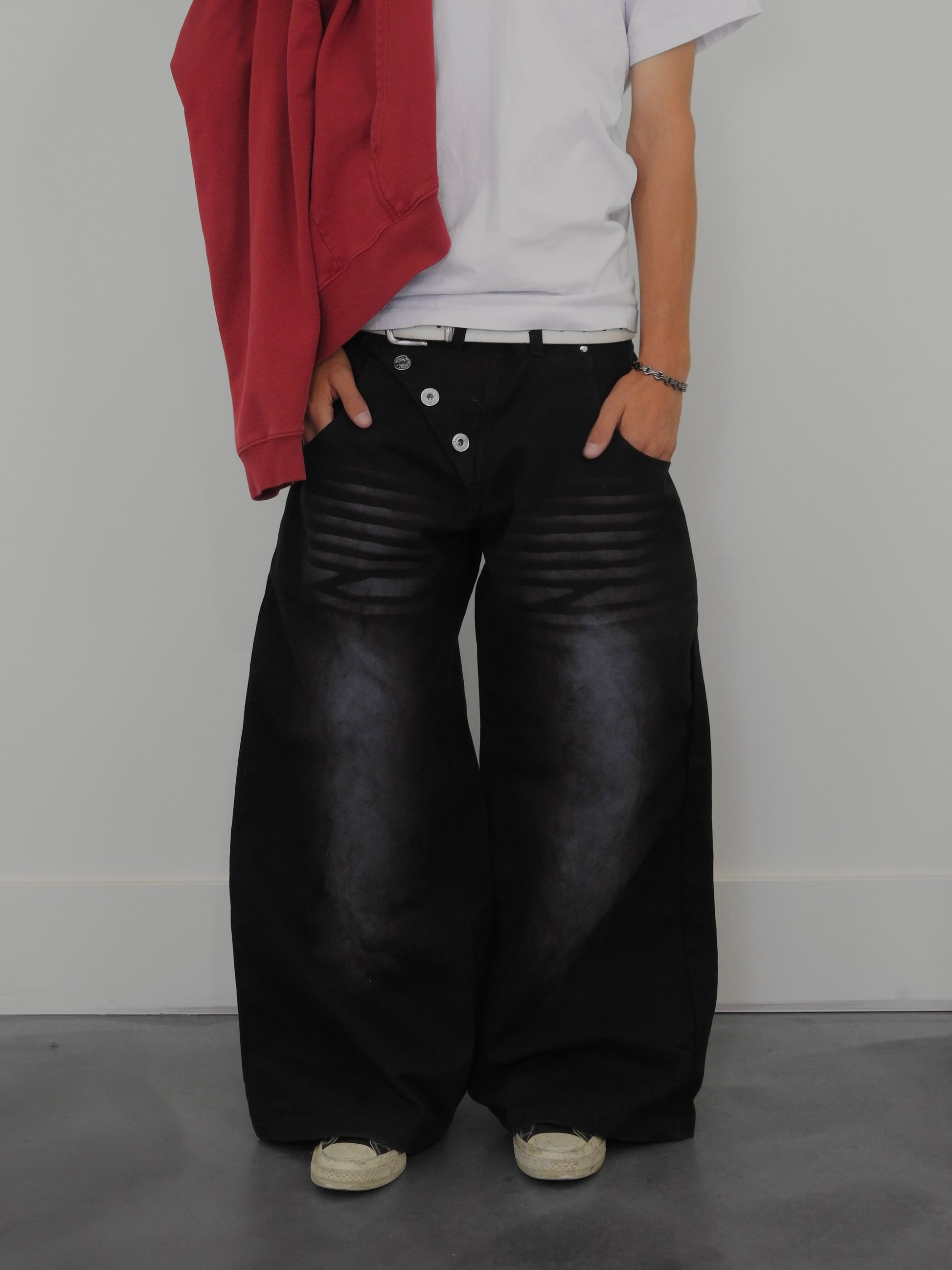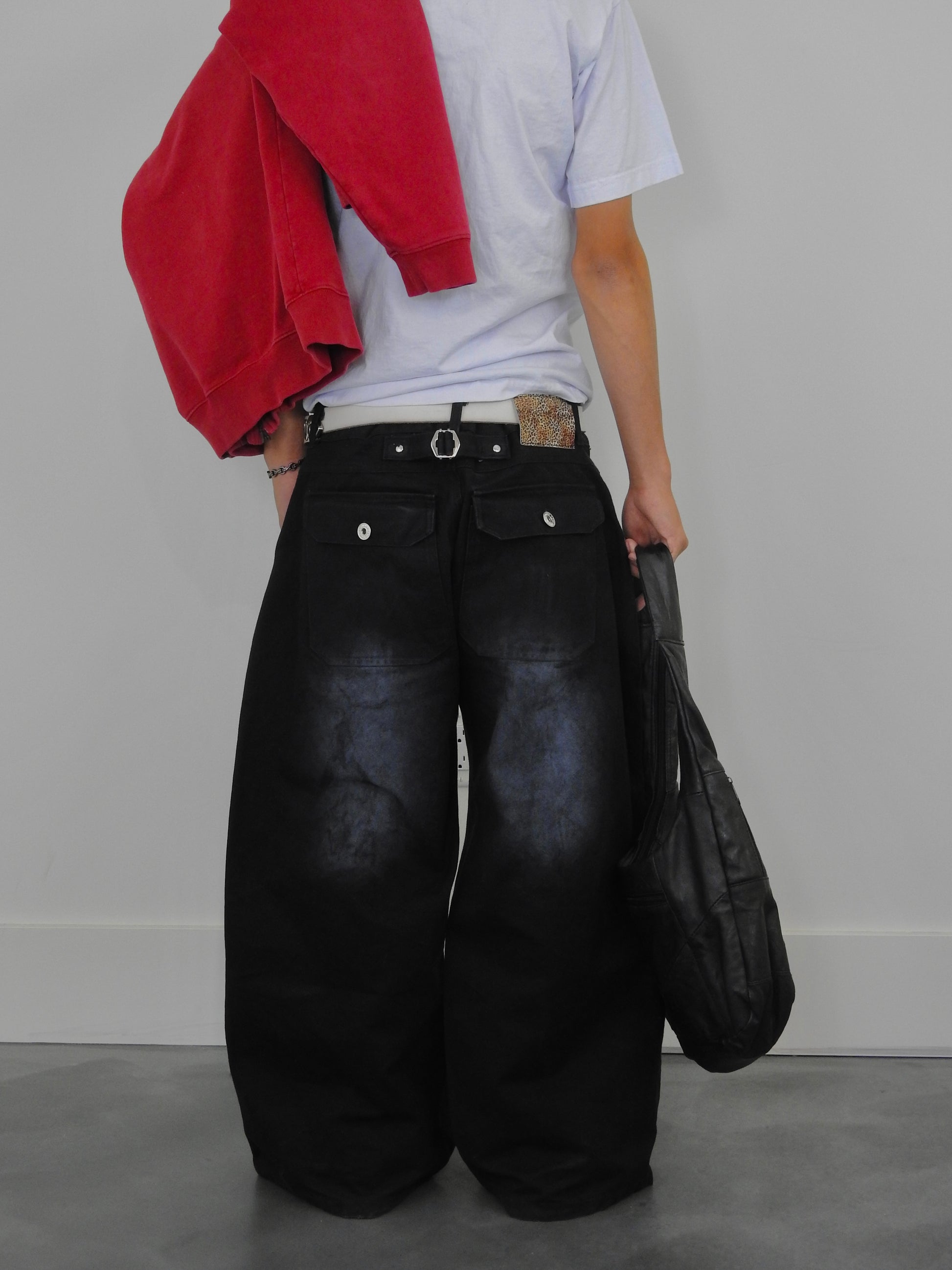 Our 14 oz duck canvas, features deep curved front pockets and a unique curved five-button fly. As well as a back buckle and a cheetah print leather back tab.